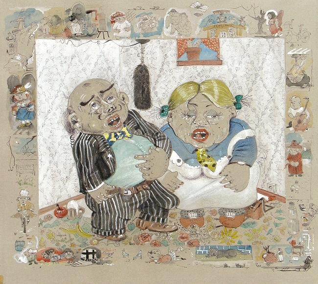 oben: Michael Karlovski: Ewa, 2003, rechts oben: Tatiana Skalko-Karlovska: Vertreibung aus dem Paradies, 2004, rechts unten: Landschaft II, 2001